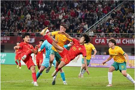 u19国足1比1战平澳大利亚,朱鹏宇在比赛中。