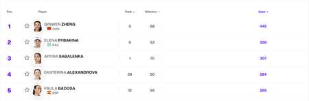 根据wta(女子网球协会)年终ace球(发球直接得分,且对手未碰到球)排名显示,中国球员郑钦文在本赛季参加的68场比赛共打出445记ace球,是所有球员中最多,领先第二名莱巴金娜87个之多,成为年度ace女王。