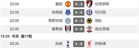 英超第17轮周日再战5场,曼联0-3负于伯恩茅斯,连续两个赛季主场被樱桃反咬三口,切尔西被埃弗顿逼平。