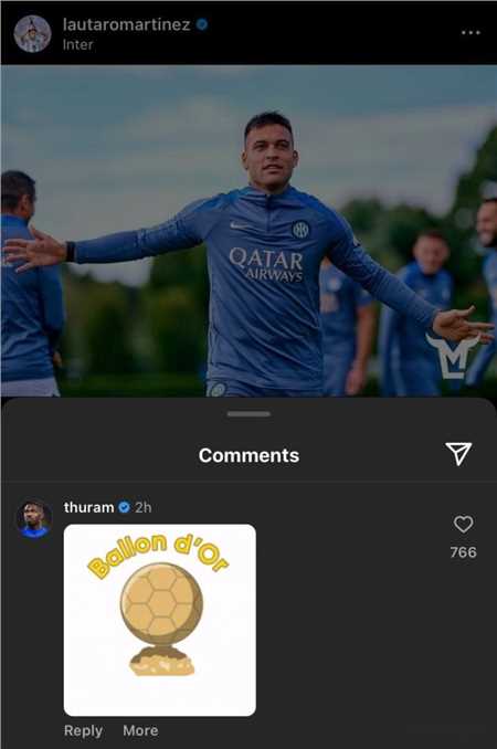 在这种情况下,马库斯-图拉姆也适时地为自己的队友造势,他在劳塔罗的动态下发布了一张金球奖的图片,表达了自己对这位阿根廷球星竞争金球奖的支持。
