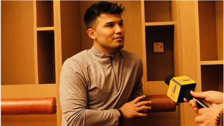 完成参观报道后,我们离开前经过球队健身房,偶遇了正在做康复训练的广州队生力军球员艾沙江库尔班,于是观看完他的训练后,在更衣室坐下来面对面聊了一会,主要问问其近况。下面便为大家呈现访谈的所有内容。