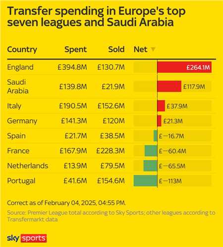 北京时间2月4日,天空体育统计出了今年冬窗欧洲前七联赛以及沙特联赛的转会支出和收入情况,英超以2.641亿英镑的净支出排名第一,沙特联赛第二,意甲第三。